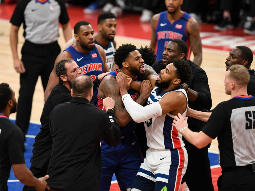 引言:球场上的火药味如何演变成全武行 篮球赛场本是竞技与激情的舞台,但当情绪失控,比赛往往会偏离轨道。近日,森林狼与活塞的比赛中,一场激烈的肢体冲突震惊了球迷,双方球员上演“全武行”,甚至出现了掐脖和扭打的场面,最终导致7名球员被驱逐出场。这不仅是一场比赛的插曲,更是对职业体育精神的一次拷问。究竟是什么让这场比赛如此剑拔弩张?让我们一探究竟。